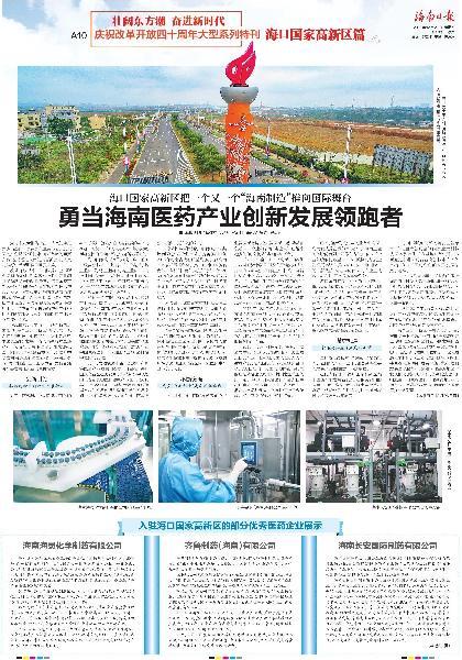 海南長安國際制藥有限公司榮登2018年12運(yùn)27日《海南日?qǐng)?bào)》A10版慶祝改革開放四十周年大型系列特刊??趪腋咝聟^(qū)篇“勇當(dāng)海南醫(yī)藥產(chǎn)業(yè)創(chuàng)新發(fā)展領(lǐng)跑者”一欄。詳細(xì)報(bào)道如下: